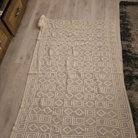 Heklet teppe 130x125 cm. Usikker på hvilket garn som er brukt.