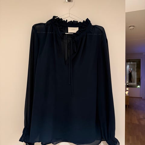 Lekker bluse i merket: Just Female, med lys beige bunn og smale striper i svart og rødt, har skjult knepping foran og vanlig skjortekrage. Kvalitet: 100% viskose, litt tykk kvalitet som faller veldig fint. Blusen er ALDRI brukt og fremstår som t pen. Str L, selges kr 500,-
