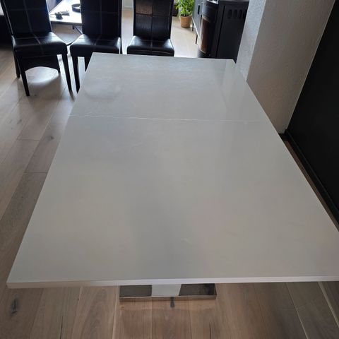 Elegant hvit høyglans spisebord selges. Bordet er 180 cm pluss en tilleggsplate som medfølger. Med tilleggsplaten blir det 230 cm.