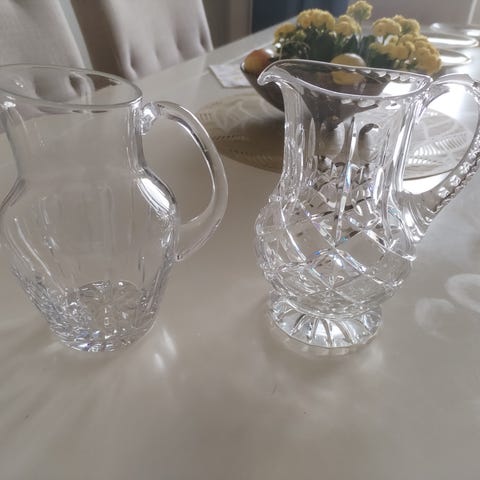 2 små glassmugger H: 13cm selges. Fin til f. Eks olje & balsamico. Selges samlet kr.100,-