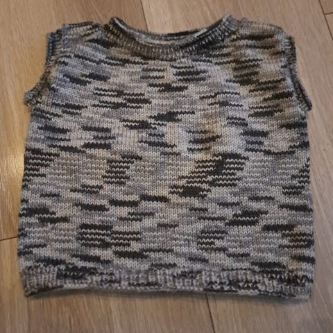 Veldig fin hjemmestrikket ullvest i lilla farge med striper og mønstre. Passer fra str 104 til str 116.