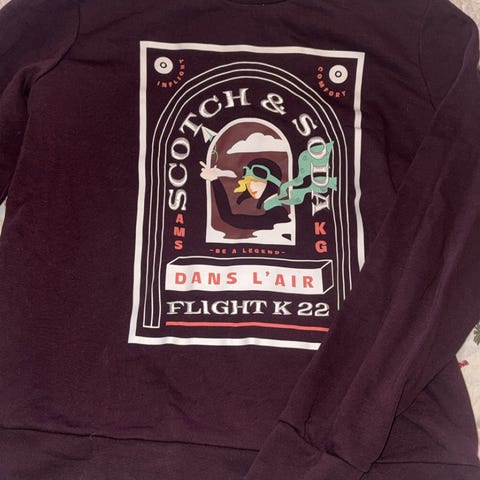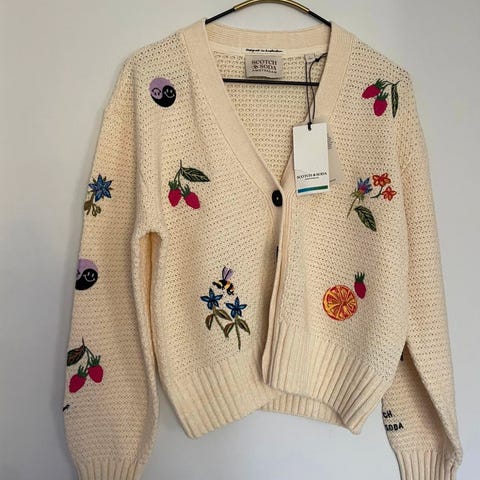 Lang cardigan fra Scotch & Soda i leopard mønster, i mørk blå og rustrøde farger. To dype lommer foran. Ny, aldri brukt. Str er XS men den er som en Small.