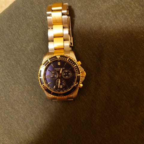 Selger min Victorinox klokke da jeg ikke lenger benytter denne. Følger med original-forpakning og ledd til klokken. Klokken er noe skadet i skiven (se bilde), men denne kan tas av og byttes.