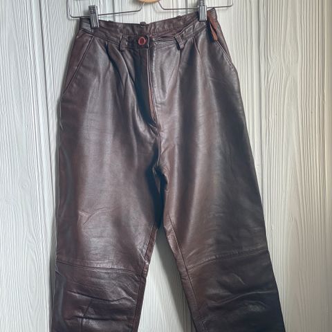 Supercool vintage sort skinnbukse med legg foran, lommer og fra 80-tallet. I utmerket stand. Skinn skal ikke vaskes, men renses, men søler en på den, kan en bruke en fuktig klut å bare tørke av. Selges kr 300,-(b10)