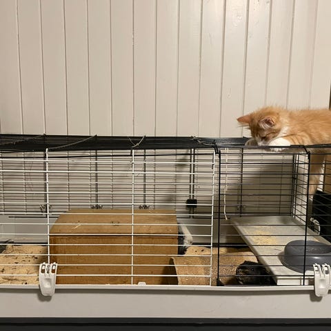Flott marsvin bolig laget av junior seng med syrefast plate i bunn og ene siden for enkel rengjøring og med god plass , inkludert masse utstyr selges. Her kan man lage mange ulike innredninger .
