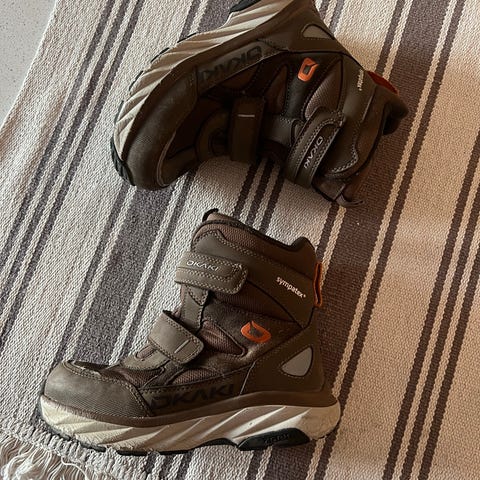 Okaki vintersko str 33. Pent brukte i en vinter, litt slitasje oppå den ene skoa, se bilde. Selges derfor billig. Hentes på Sveberg eller sendes mot porto.