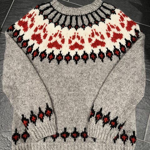 Nydelig villmarksgenser selges da den ikke blir brukt. Strikket med Alafossloppi garn. Passer S-M. Kun brukt noen få ganger. Fremstår ny.