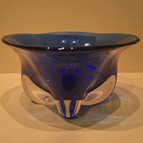 Skål eller telysholder i nydelig blåfarge. Måler ca 15x8 cm og veier ca 440 g. Praktfull vintage telysholder eller godteskål eller bare til pynt. Nydelig i vinduet når lyset faller gjennom den.