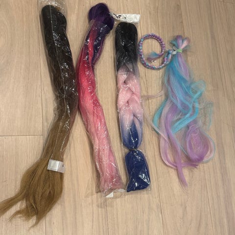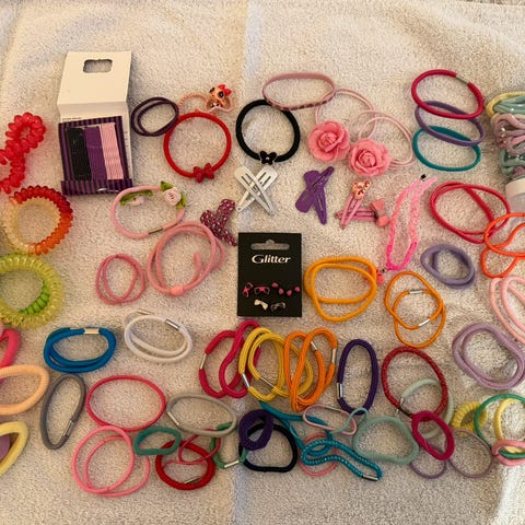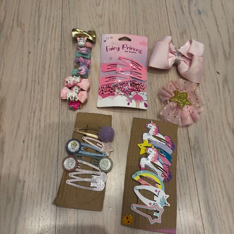 En pakke med mange søte hårspenner og hårstrikker. Alt selges for 150,-kr.