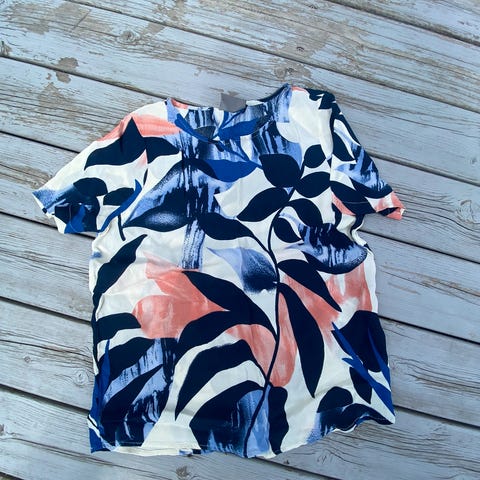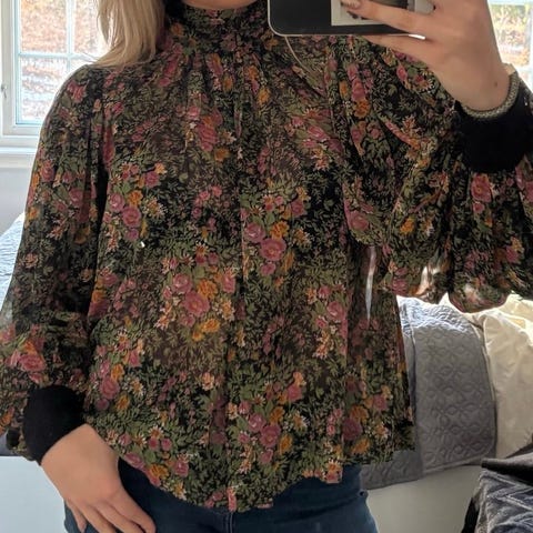 Nydelig småblomstret bluse fra H&M Str XS. Passer nok også en S. Liten rysjekant i halsen med knyting. Strikk nederst på ermene.