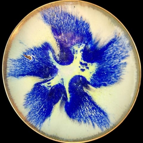 Selger en eldre porselensskål med rann av gull ytterst. Dekoren er blå, kan minne om et øye.