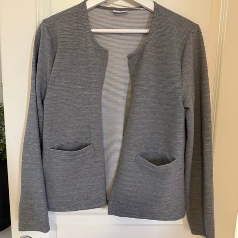 Pent brukte grå cardigan med belte i str. M selges, lite brukt.