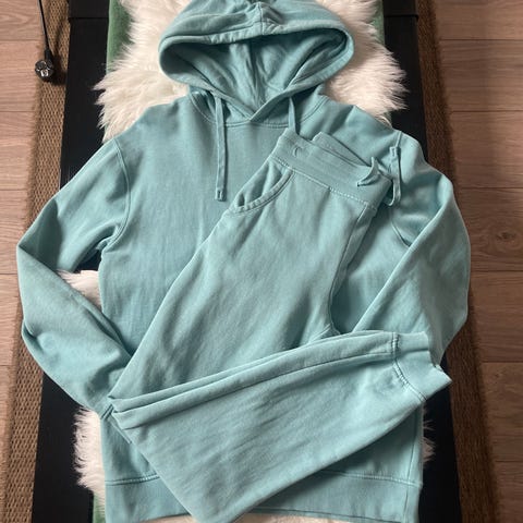 Loungeset / joggedress. Smal finstrikket bukse med tilhørende cardigan som går rett nedenfor rumpen i 100% merino ull.