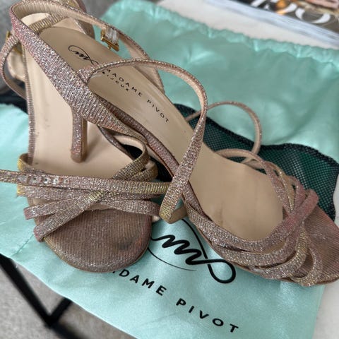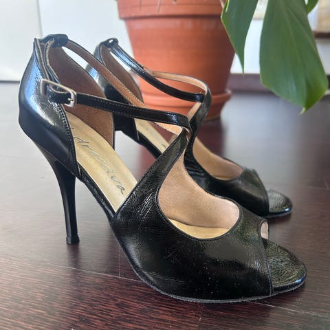 Vakre elegante tangosko med filt saale i strl 38. Som nye. Brukt 2 ganger. Sort lakkskinn og sateng dyreprint. Spennende design