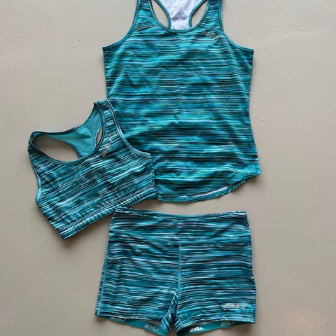 Superfint treningssett fra Röhnisch. Lappene er klipt av, men det er aldri brukt. Sports-BH Julie og singletten er størrelse S og shortsen er størrelse M.