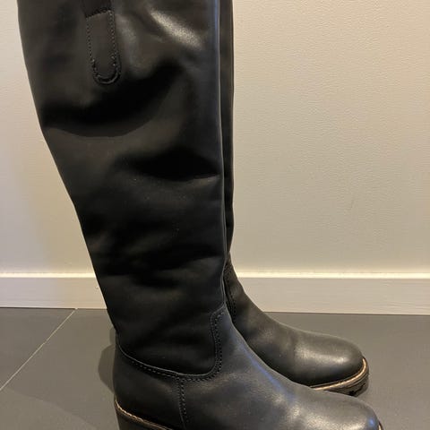 Nye sorte skinnstøvletter med kilehæl og gummisåle. Uforet.