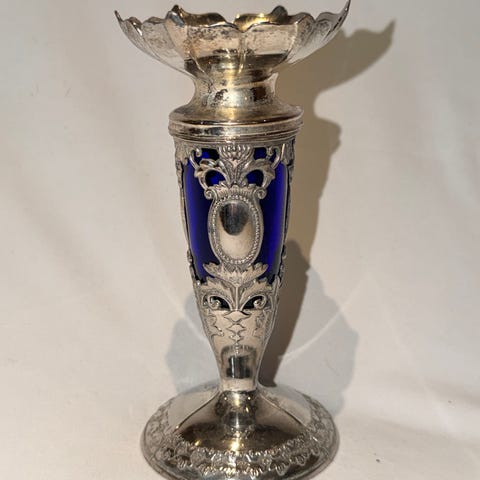 Jeg finner ingen stempel men det var vanlig at disse ble laget i sølvplett.