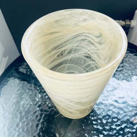 Vakker håndlaget og munnblåst vintage glassvase med diagonale striper i duse farger fra Plus glasshytte i Fredrikstad. Vasen er designet av Benny Motzfeldt og syremerket Plus BM Norway under.