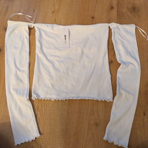 Mmønstret topp i hvit for kvinner. Størrelse M. Topp med detaljerte sorte mønstre som gir et unikt utseende. Passer til ulike anledninger.