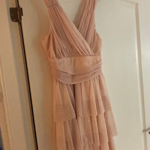 Tzar London fotsid sort kjole med svakt mønster med gull engler. 80% nylon og 20% elastan ermløs med knyting bak hals eller over skuldre. Perfekt til julebordsesongen