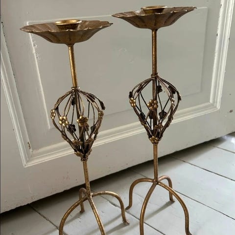 Lysestaker i sølvfarge/metal selges. Den laveste er 40 cm. Den høyeste 46,5 cm.