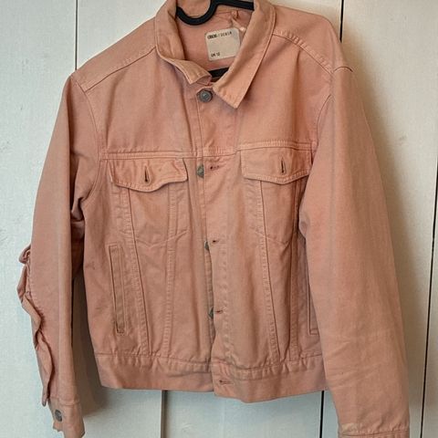 Lakserosa jakke med trykknapper og lommer. Det er puffermer. Det står ikke størrelse, men den er for stor for M om man ikke vil ha oversized