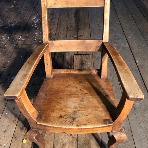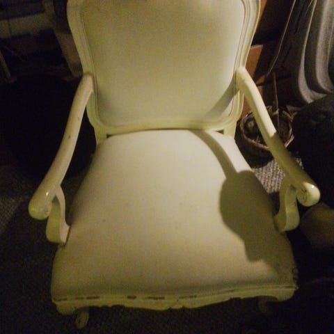 Stolen ble kjøpt i brukthandel på 70-tallet. Den var delvis avlutet da den ble kjøpt, så det er en del gammel hvit maling igjen på baksiden. Den har en fin patina som den er, for den som liker det. Stolen har en setehøyde på 40 cm, så hvis en vil bruke den til å sitte i, så er det best med en pute i setet. For at den skal være god å sitte i, bør en også montere en pute i åpningen i ryggen, og jeg tror det er sånn den opprinnelig har vært brukt. Uten disse putene tenker jeg at stolen er best egnet for den som har et ledig hjørne der stolen kan stå som et klenodium pyntet med pledd og puter eller annen pynt. Stolen fremstår som «hjemmelaget», men med en del fine detaljer. Kan leveres på strekningen Valdres/Gjøvik/Hønefoss/Jessheim/Oslo hvis det passer med annen kjøring. Interesserte kan kontakt Arne på 91749081. 😊