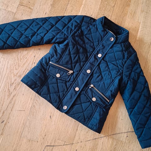 Fin vaffeljakke / quilted jakke som passer til både gutt og jente. Mørkeblå med gulldetaljer. Perfekt som høstjakke