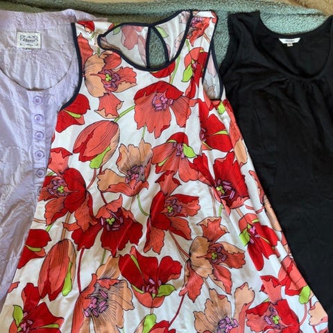 Sydenkjole 25.kr.. Stripete fra Zizzi str s. 50kr. Blå kjole m perler 50kr. Tunika fra Zavanna xxl. Kan sendes.