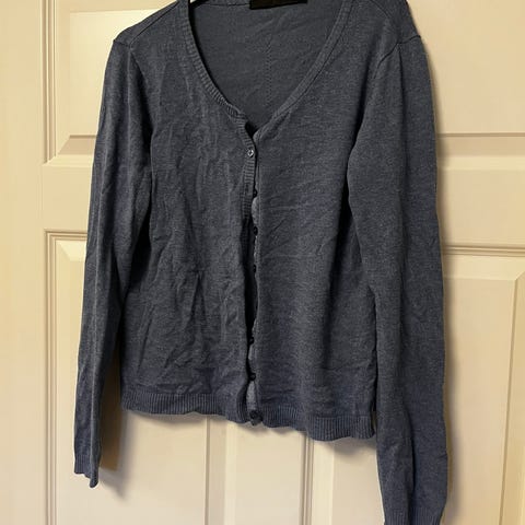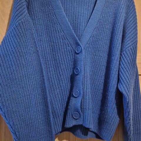 Søt, blå genser. Lang modell. Swipe for å se de forskjellige måtene man kan style den på 🫐