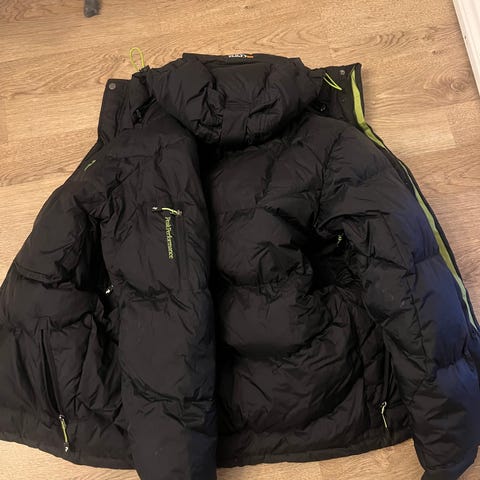 Veldig fin jakke, lett og varmt, store lommer. En S men stor, jeg bruker normalt M