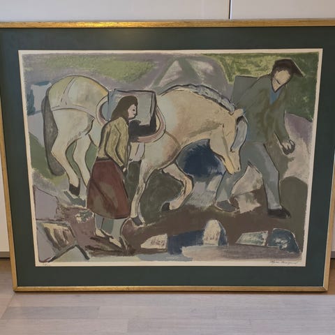 Oljemaleri malt med olje på plate. Maleriet er signert med initialer RK, trolig maler Ragnar Kraugerud (1909 - 1987).