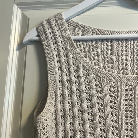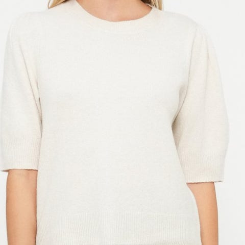 Strikket topp fra med korte puffermer. Toppen er beige og har vanlig passform. Den har rund hals og ribbestrikk i nedre kant