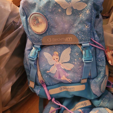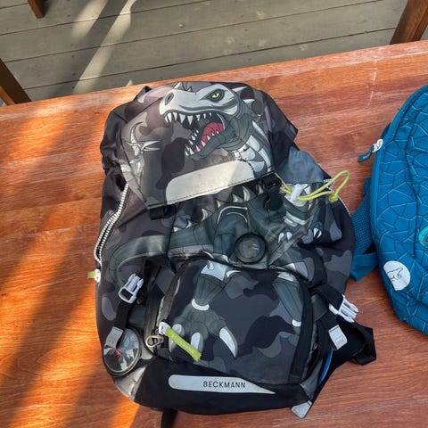 Beckmann Dinosaur ryggsekk for barn i blått med dinosaurmotiv. Sekken har justerbare stropper og flere lommer for oppbevaring av skoleutstyr. Laget av slitesterkt materiale, ideell for skolebruk.