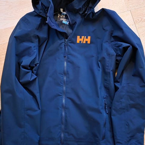 Helly Hansen jakke for jenter i størrelse 174, med blått mønster og oransje detaljer. Jakken er laget for barn og har en hette. Materialet og designet er tilpasset utendørs bruk.