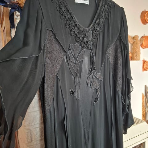 Unik gallakjole i myk velur, slepet er 160 cm med liten ring i enden for å holde oppe sløret. Sitter som støpt på med knytting i livet, 68 cm. Lange armer, 75 cm og 24 cm vidde ved håndleddet.