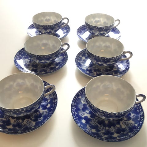 Er en ubetydelig feil på den ene koppen: er det et lite merke øverst og litt på kanten av koppen (se bildet). Selges derfor billig til totalt kr 120,-.