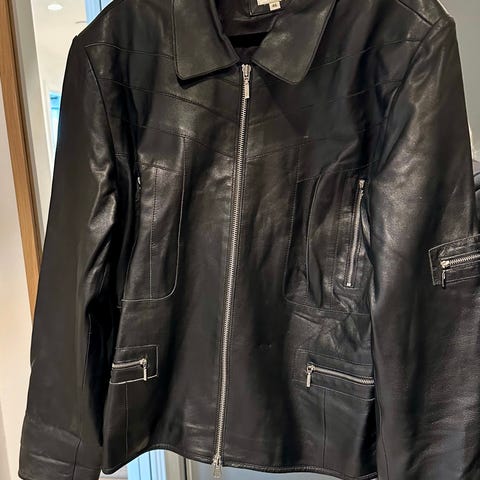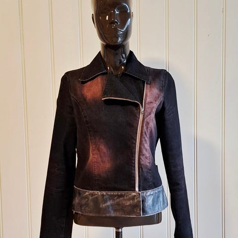 Ny Carla F. skinnjakke med glidelås kombinert med semsket skinn i olivengrønn farge og lange ermer med glidelås i sort farge av lammeskinn, to lommer foran med glidelås . Fòret.
