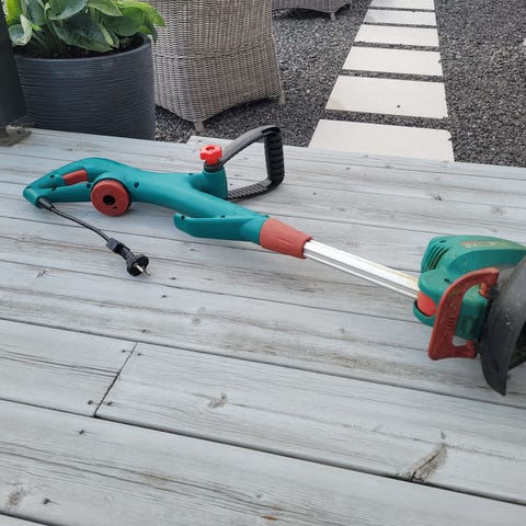 Eldre klipper. Går greit. Kan være litt vrien å starte, men går fint når den sviver. Tom for tråd. Ny spole koster ca 250kr
