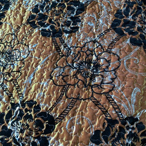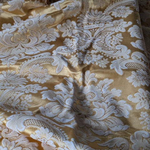 Kult Vintage stoffstykke i dyp gul farge. Ca 300 x 93 cm. Skimmer i «broderiene» og litt glatt på overflaten. Skikkelig kult stoff som kan brukes til et syprosjekt eller hva det måtte være.