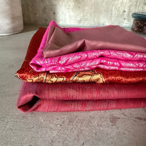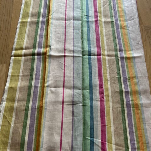 Tre tøystykker, kan også brukes som duker da de er innsydd i kantene. Se mål på hvert bilde. To av stykkene/dukene har samme fargekombinasjon og er omtrent samme størrelse.