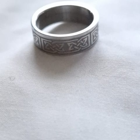 Ring med runeskrift i sølv. Ser ikke merking, men føles tung.