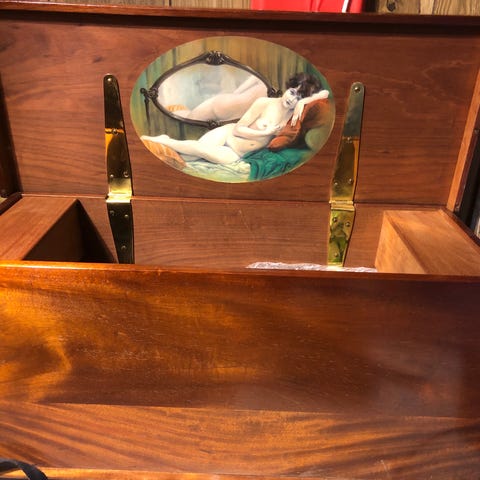 Utskåret, gammelt troll. Høyde ca 9 cm. Stokken er brukket nederst, den bør kunne erstattes med en lengre. Han må ha stokk for å kunne stå. Ukjent hvem som har skjært den ut, det kan se ut som signaturen er fjernet, se bilde. Kan sendes.