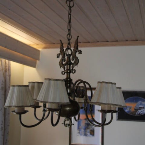 Fin måneskinnslampe 65 cm fra taket, kan reguleres. Selve lampa ca 36 cm høy.