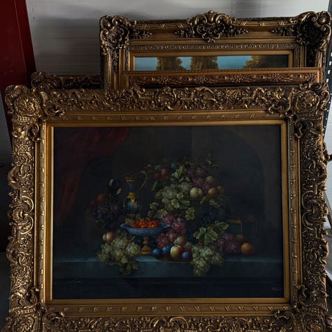 Fint og dekorativt gammelt bilde med frukt og blomster.