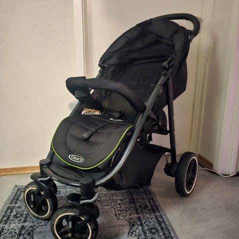 En barnevogn med avtagbart sete og en stor kurv. Flott for shopping sammen med et barn eller ta et annet barn på forlengelsesplattformen for stående, som også har et sete for barnet å sitte. Vognsetet kan justeres og barnet kan legge seg ned og sove i vognen. Den er sammenleggbar og får enkelt plass i en bil (passer i Mazda 3). Setet har et ekstra tilbehør, en bag for et barn som kan brukes om våren og høsten. Kjøpt fra utlandet (https://gracobaby.eu/en/evo-xt-all-terrain-pushchair)
