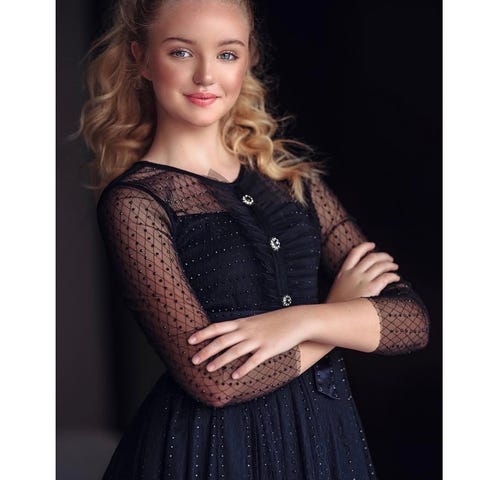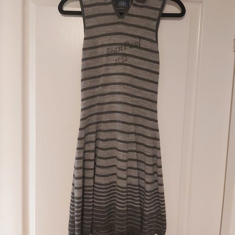 Selger en knapt brukt mørk blå Ola-kjole i merket Jean Paul, str. 140 med rosa detaljer og rysjer. (Fargen er mørkere enn den fremstår på bildene)