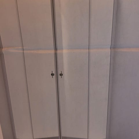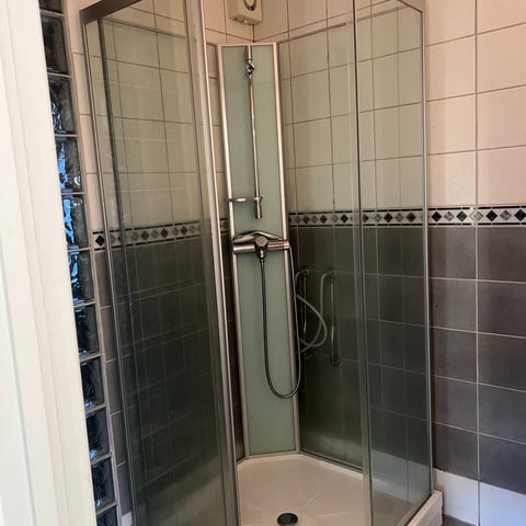 Dushjørne, hvit 90x90 buet tilsalgs. Plassbesparende (dører slår ikke ut i rommet).