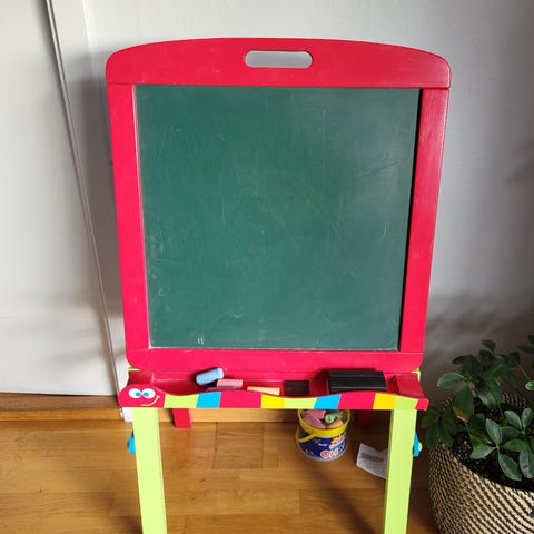 Godt brukt skrivetavle til barn. Det er magnet tavle på andre siden med bokstaver og tall. Tavla kan snus. Det er en klokke og en abakus på, og en plass til kritt.