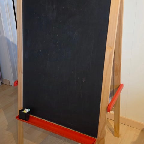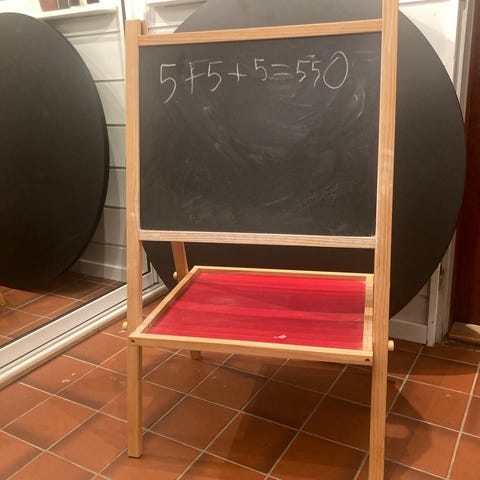 Skrivetavle for barn, med klokke der en viser er borte. Den har gangetabell og en abakus. Det er en hvit og en svart side.